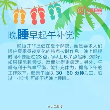 4.不宜缺少午睡:夏季昼长夜短,气温高,人的新陈代谢旺盛,消耗量也大,容易疲劳。中午睡上半小时,对健康大有裨益有帮助。